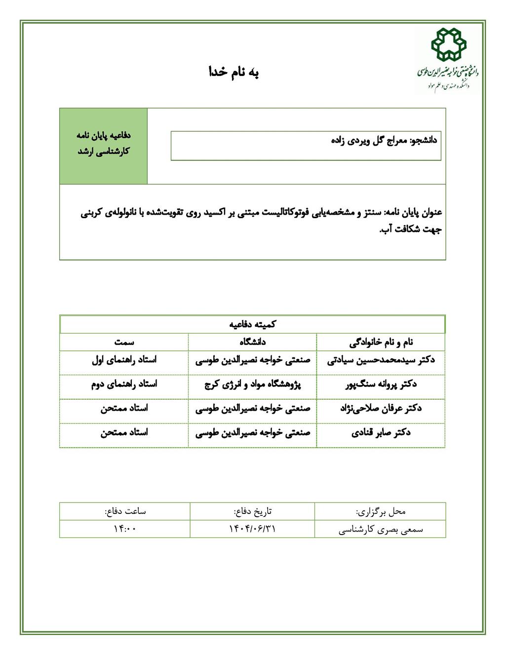دانشجو: معراج گل ویری زاده استاد راهنما: دکتر سیدمحمدحسین سیادتی