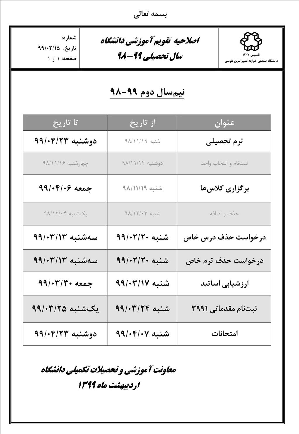 اصلاحیه تقویم آموزشی نیمسال دوم 99-98