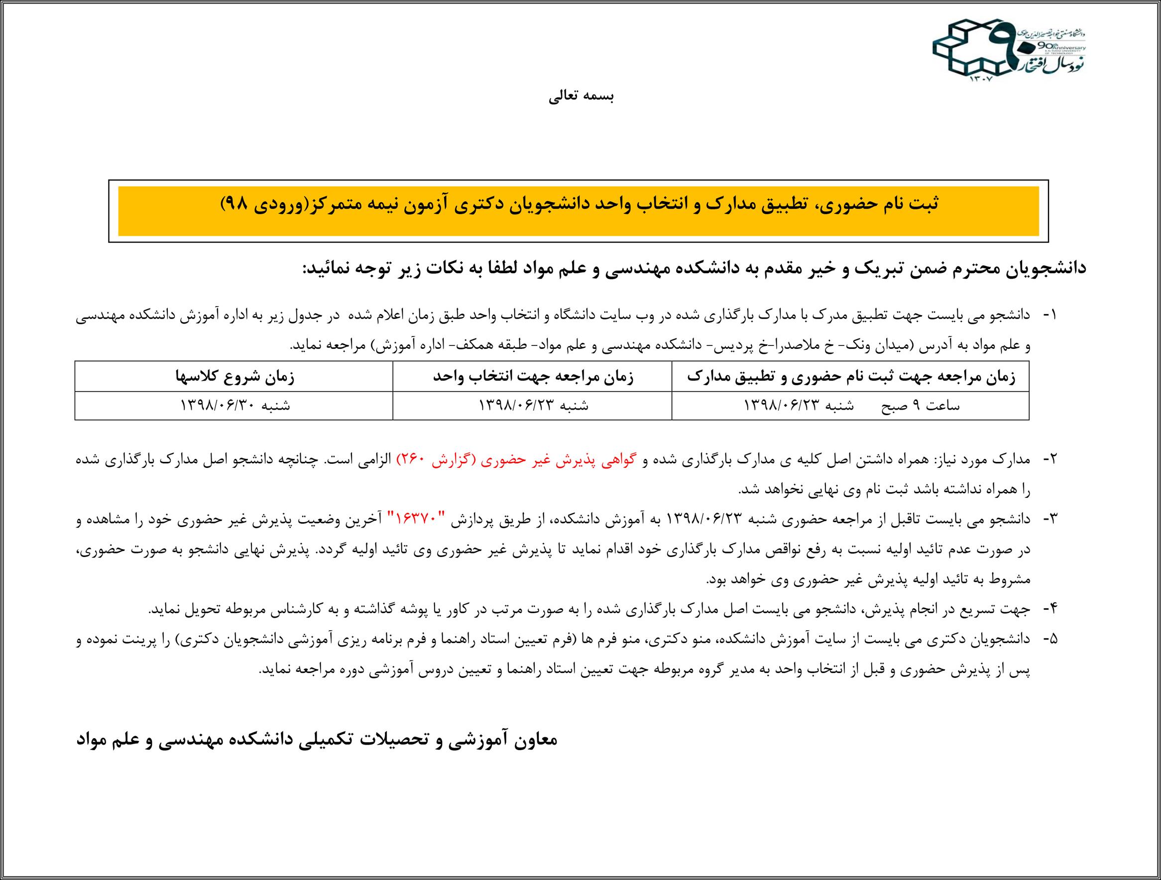 اطلاعيه پذيرش حضوري و انتخاب واحد دانشجويان دكتري آزمون نيمه متمركز ورودي سال 98مهندسي و علم مواد