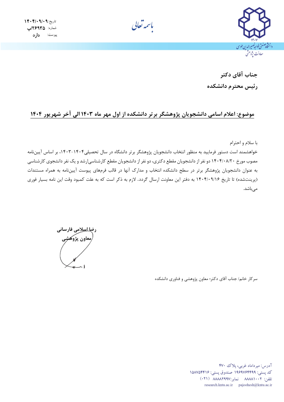 اطلاعیه اعلام اسامی دانشجویان پژوهشگر برتر دانشکده از اول مهر ماه 1403 الی آخر شهریور 1404