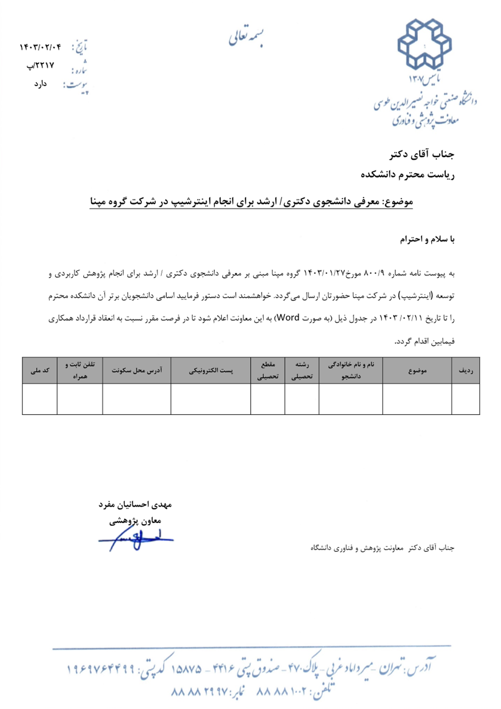 اطلاعیه اینترشیپ دانشجویان دکتری/ ارشد برای انجام اینترشیپ در شرکت گروه مپنا - دانشكده مهندسی مواد