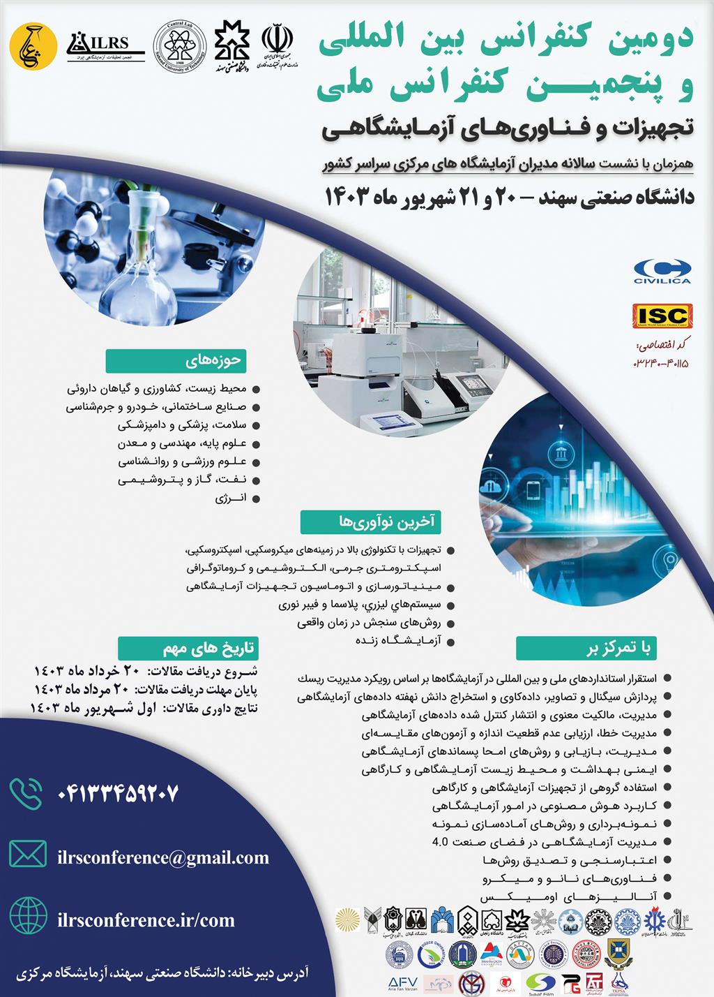 اطلاعیه برگزاری دومین کنفرانس بین المللی و پنجمین کنفرانس ملی تجهیزات و فناوری های آزمایشگاهی 1403 - دانشكده مهندسی مواد