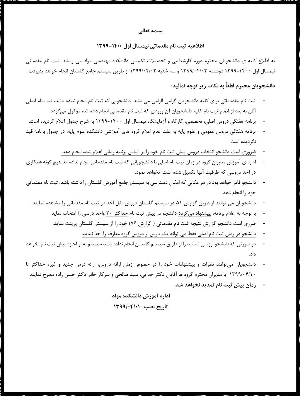 اطلاعیه ثبت نام مقدماتی نیمسال اول 1400-1399 - دانشكده مهندسی مواد
