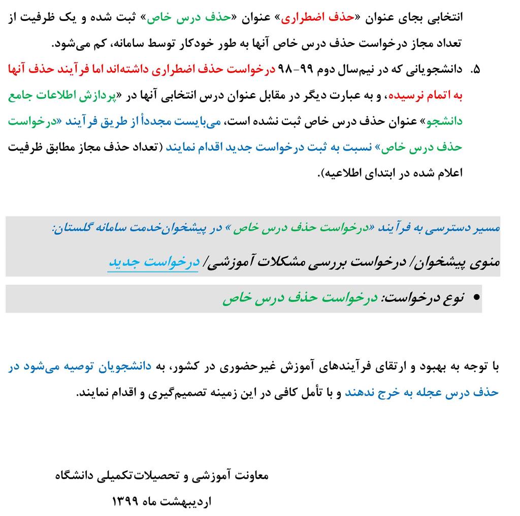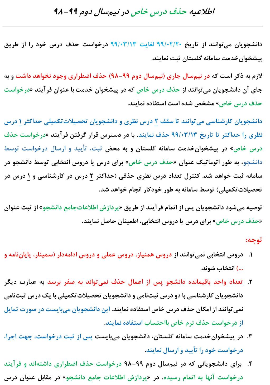 اطلاعیه حذف درس خاص در نیم سال دوم 99-98
