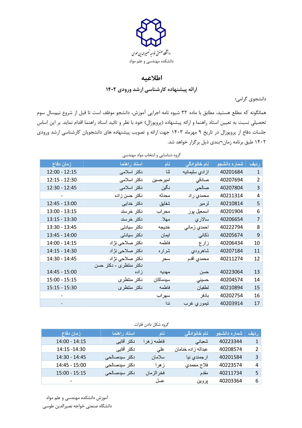اطلاعیه دفاع از پروپوزال دانشجویان کارشناسی ارشد ورودی سال 1402
