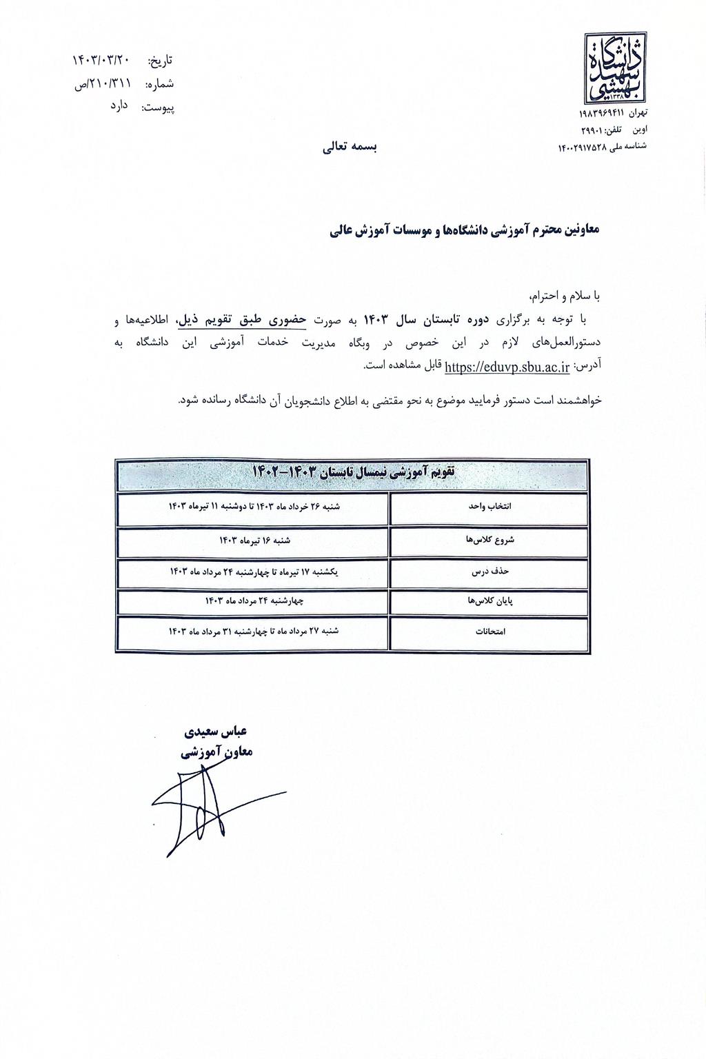 اطلاع رسانی در خصوص برگزاری ترم تابستان به صورت حضوری دانشگاه شهید بهشتی