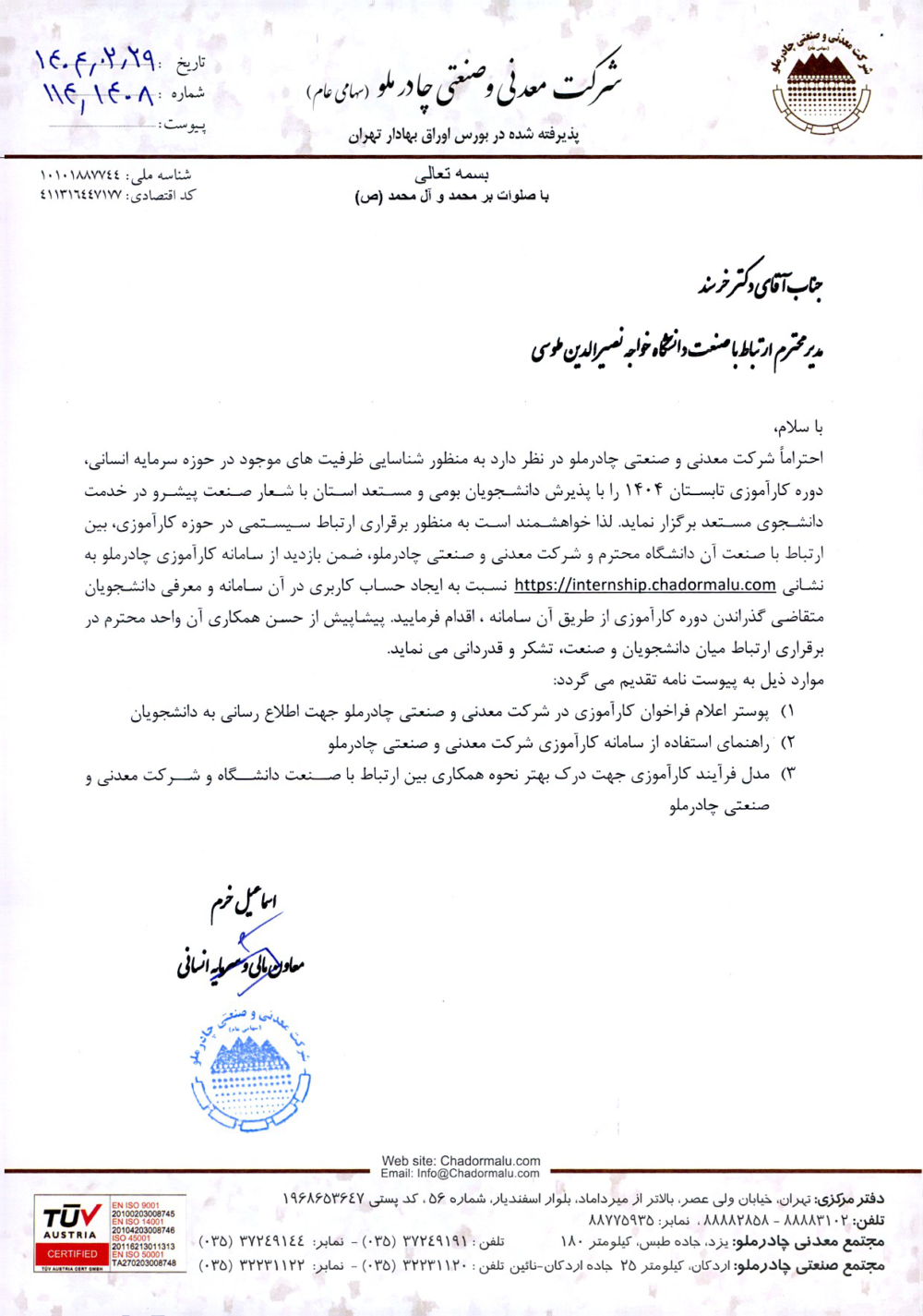 اعلام فراخوان کارآموزی در شرکت معدنی و صنعتی چادرملو