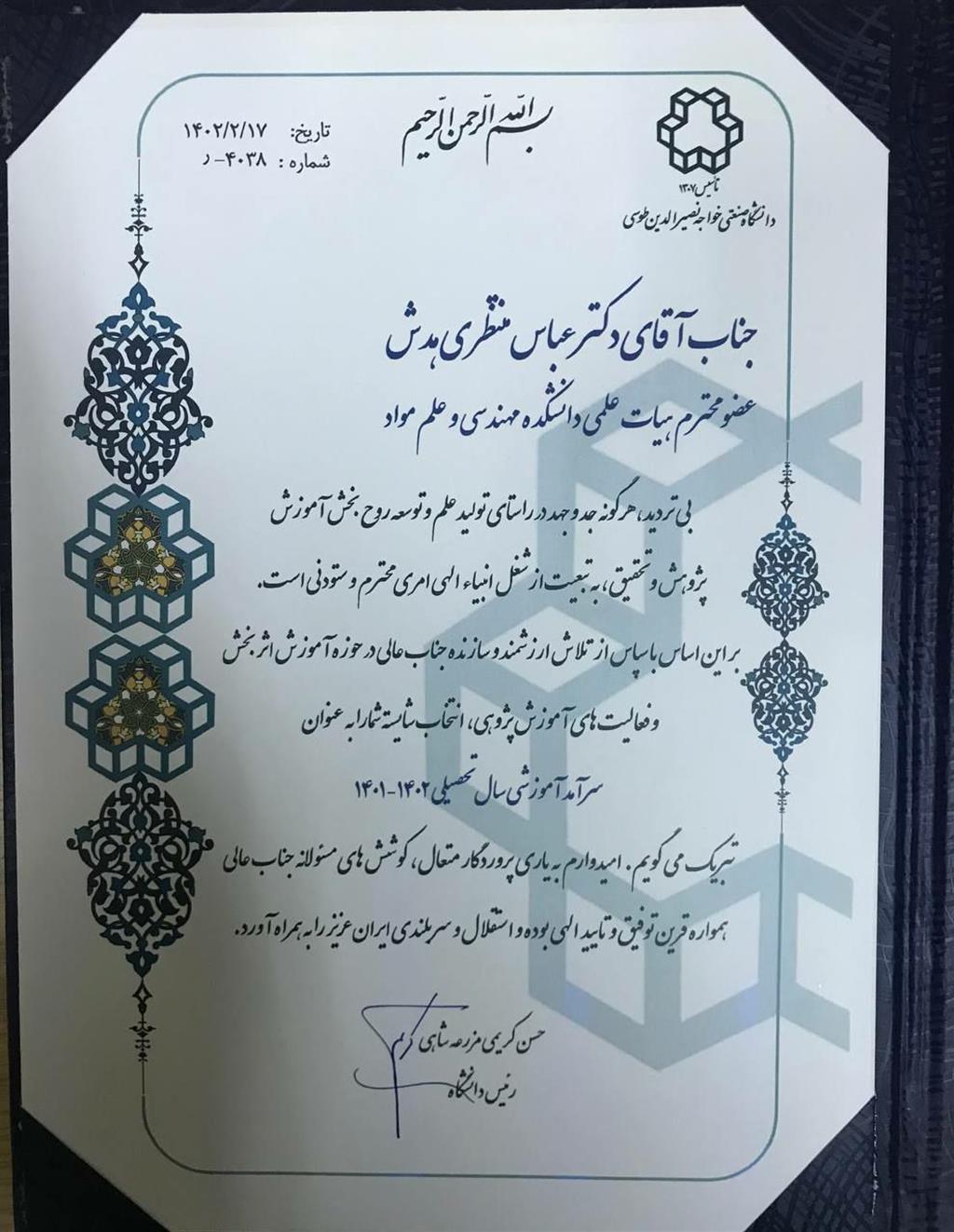 انتخاب آقای دکتر عباس منتظری هدش، عضو هیئت علمی دانشکده مهندسی و علم مواد به عنوان یکی از سرآمدان آموزشی دانشگاه در سال تحصیلی 1401-1402