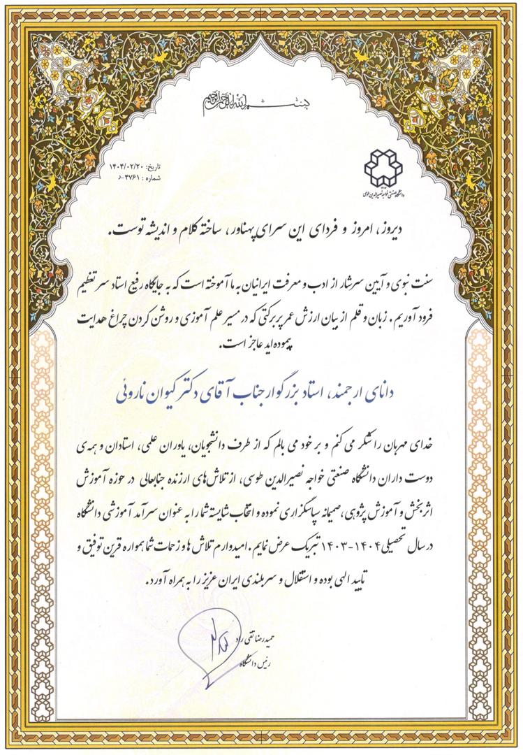 انتخاب جناب آقای دکتر کیوان نارویی به عنوان سرآمد آموزشی دانشگاه