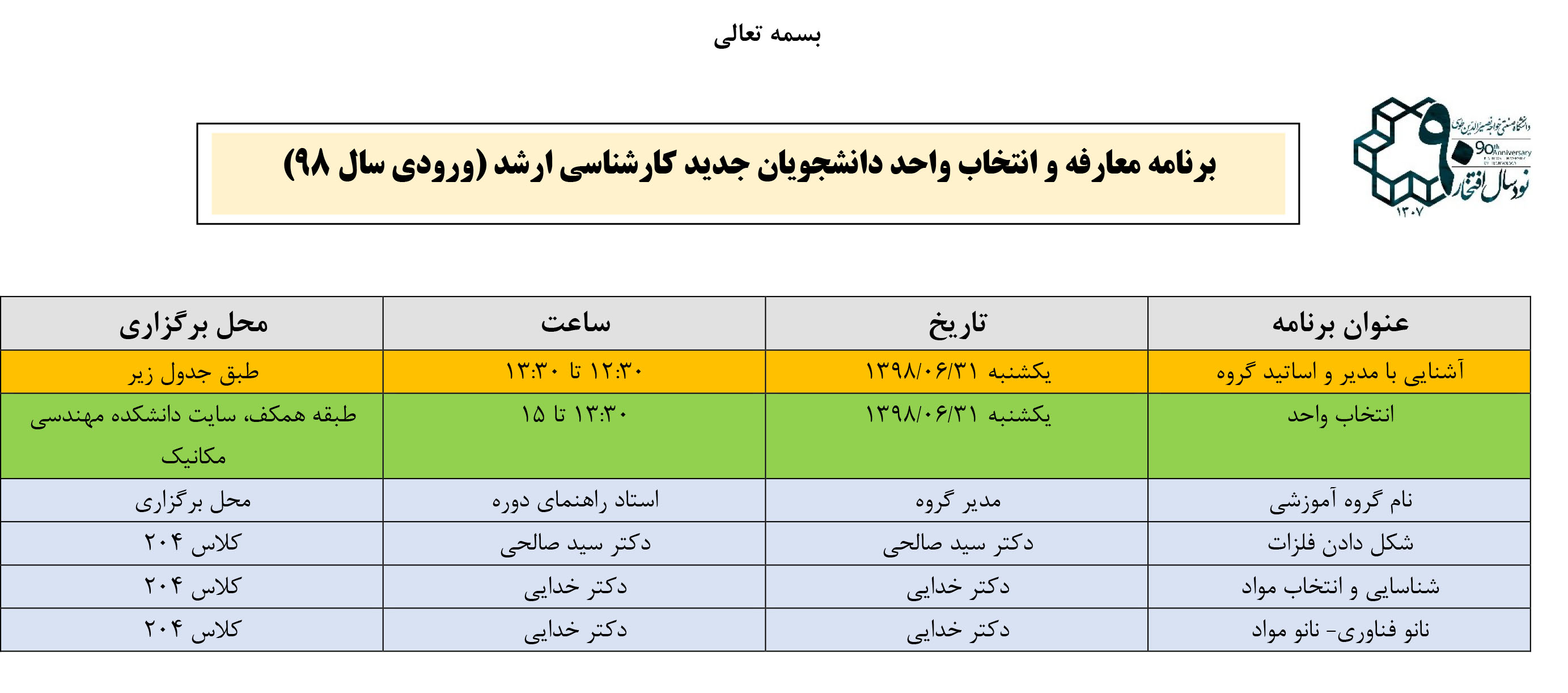 برنامه معارفه و انتخاب واحد دانشجويان جديد كارشناسي ارشد (ورودي سال 98) - دانشكده مهندسی مواد