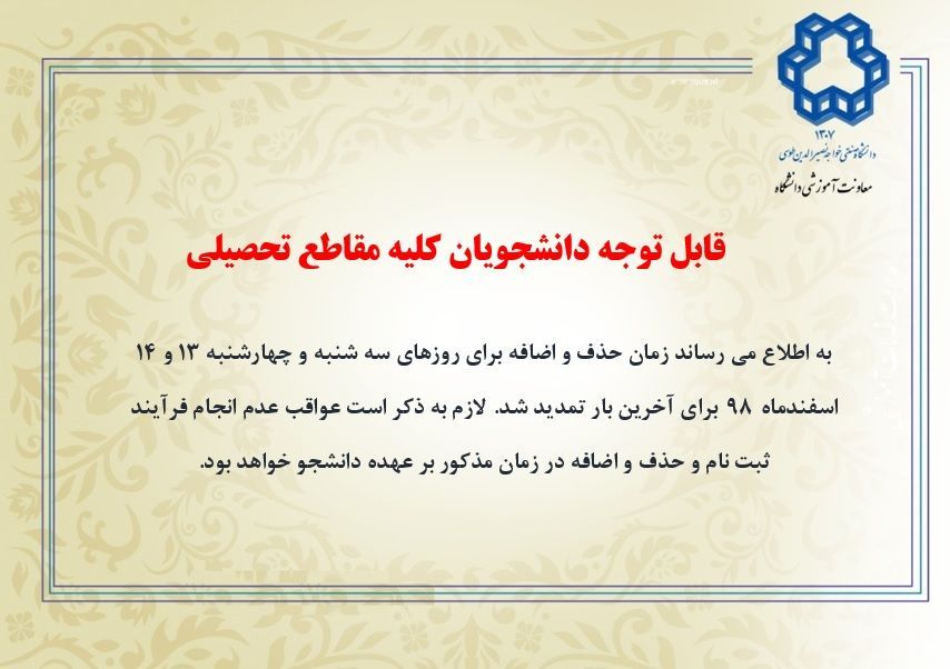 تاریخ حذف و اضافه نیمسال دوم 99-98 - دانشكده مهندسی مواد