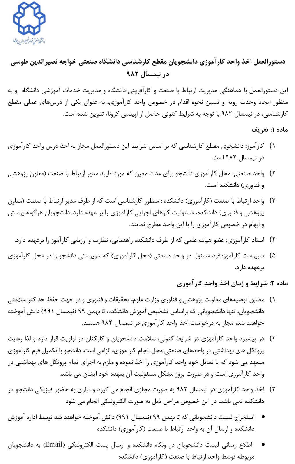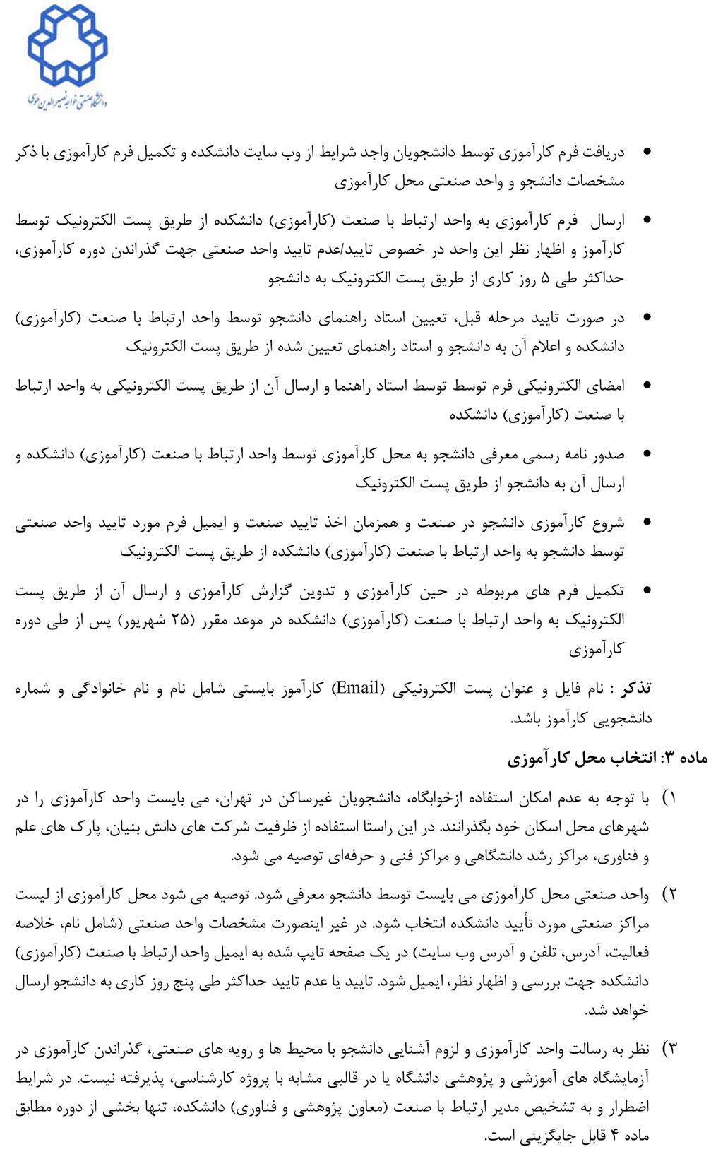 دستورالعمل اخذ واحد کارآموزی مقطع کارشناسی در نیمسال3982 - دانشكده مهندسی مواد