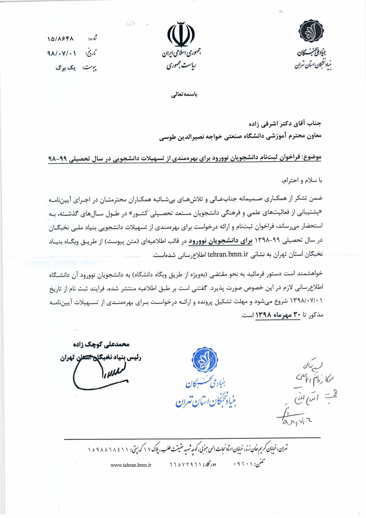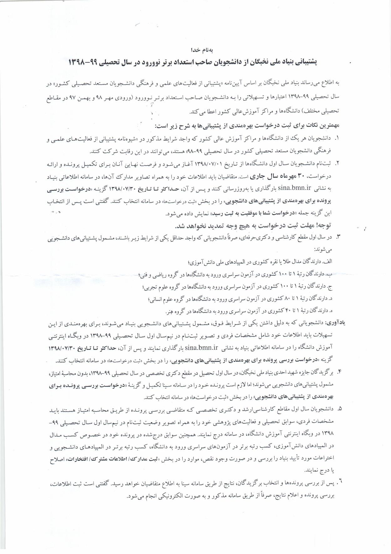 فراخوان ثبت نام دانشجويان نوورود جهت بهره مندي از تسهيلات دانشجويي (بنياد نخبگان)