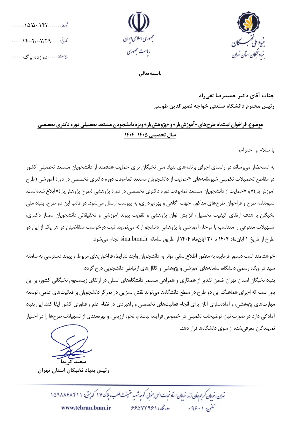 فراخوان ثبت نام طرح های"آموزش یار" و "پژوهش یار" بنیاد ملی نخبگان