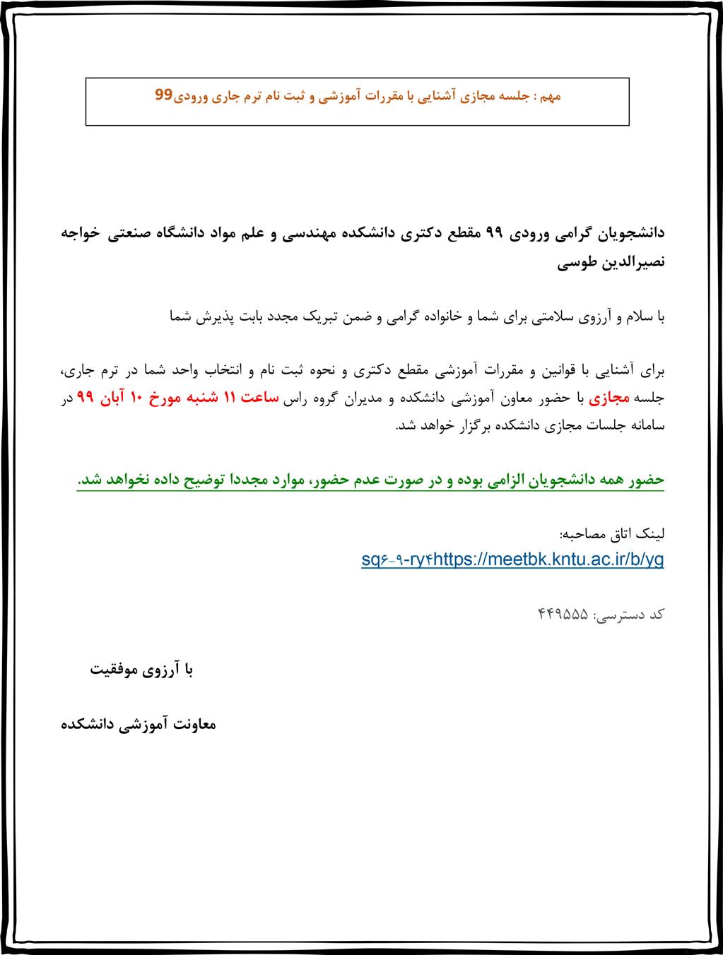 مهم : جلسه مجازی آشنایی با مقررات آموزشی و ثبت نام ترم جاری ورودی 99 مقطع دکتری - دانشكده مهندسی مواد