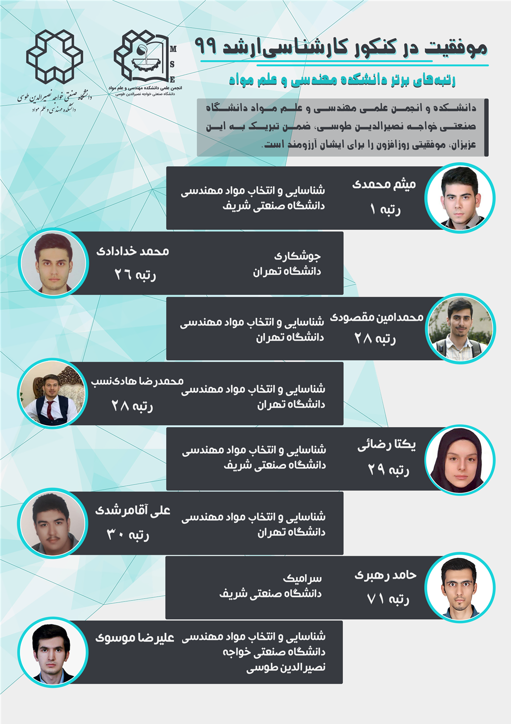 موفقیت دانشجویان دانشکده مهندسی و علم مواد در کنکور کارشناسی ارشد 99 - دانشكده مهندسی مواد