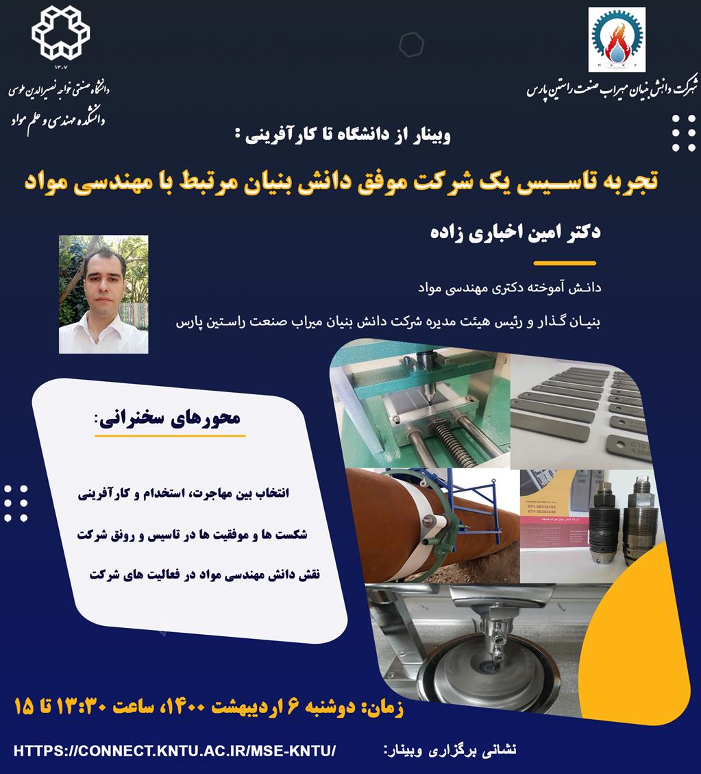 وبینار از دانشگاه تا کارآفرینی: تجربه تاسیس یک شرکت موفق دانش بنیان مرتبط با مهندسی مواد - دانشكده مهندسی مواد