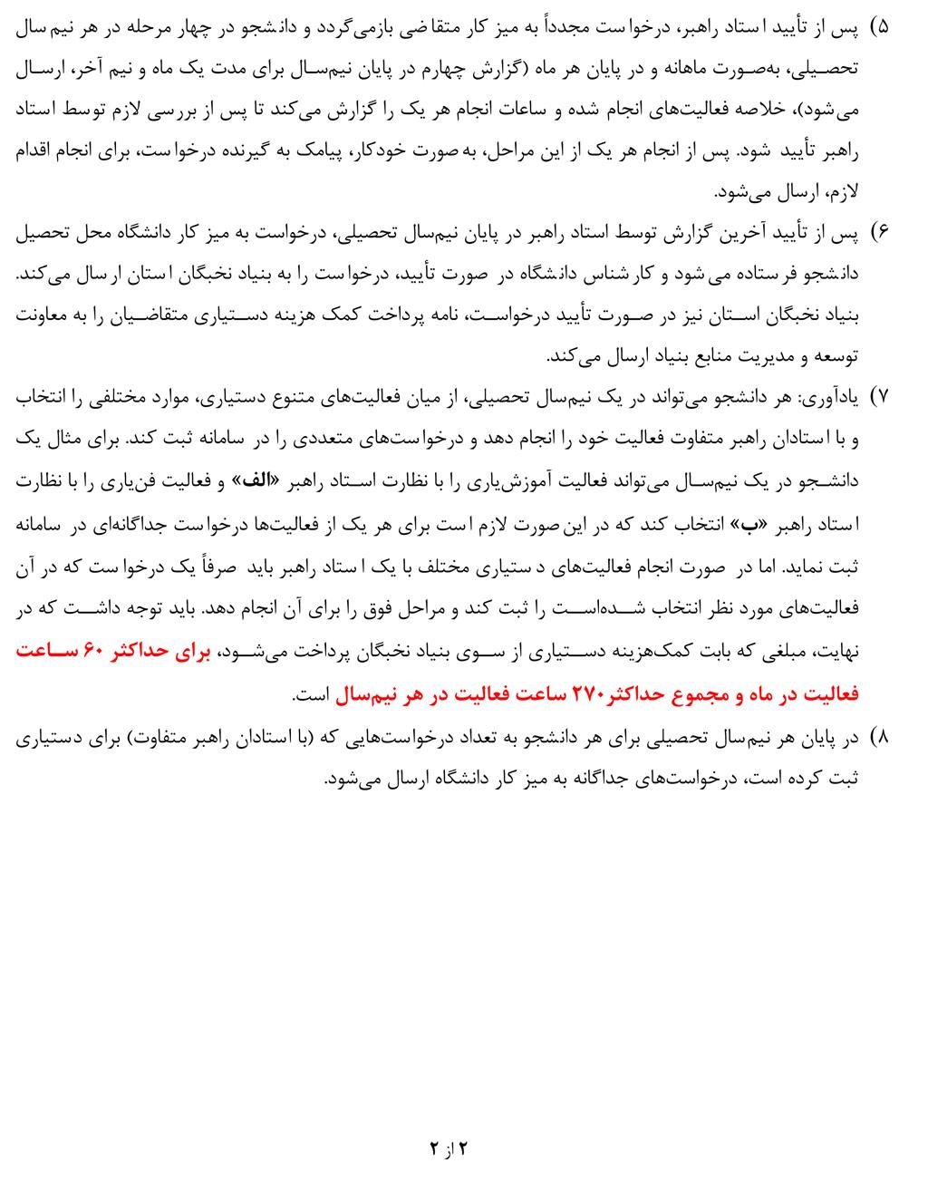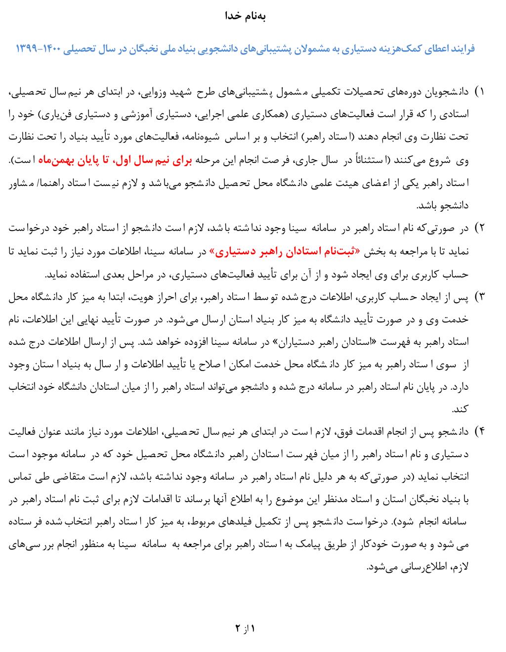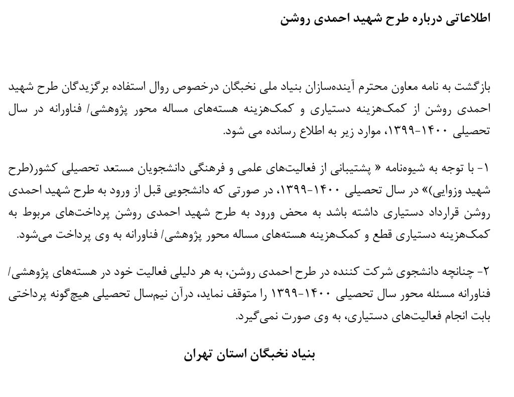 چگونگی درخواست دستیاری و طرح شهید احمدی روشن برای برگزیدگان بنیاد در سال تحصیلی 00-99