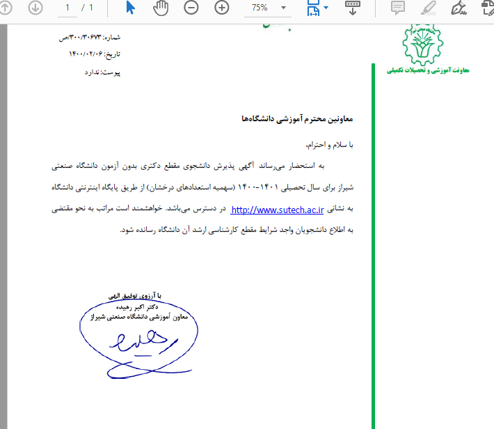 ارسال فراخوان پذیرش مقطع دکتری سال 1401-1400 دانشگاه صنعتی شیراز