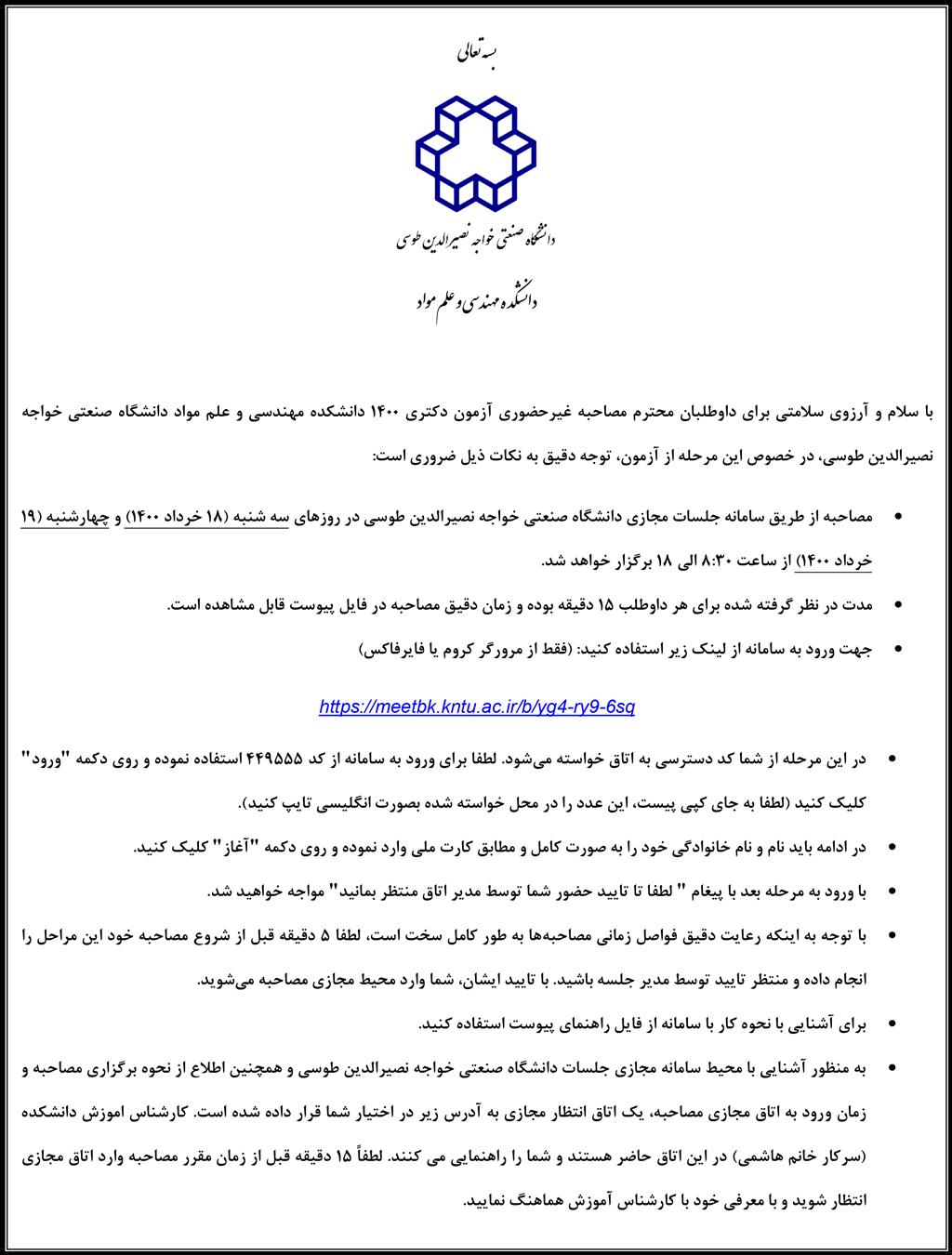 اطلاعیه مربوط به مصاحبه غیر حضوری دکتر مواد 1400 - دانشكده مهندسی مواد