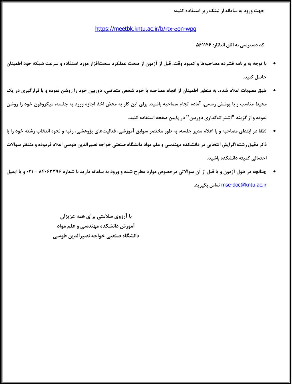 اطلاعیه مربوط به مصاحبه غیر حضوری دکتر مواد 1400