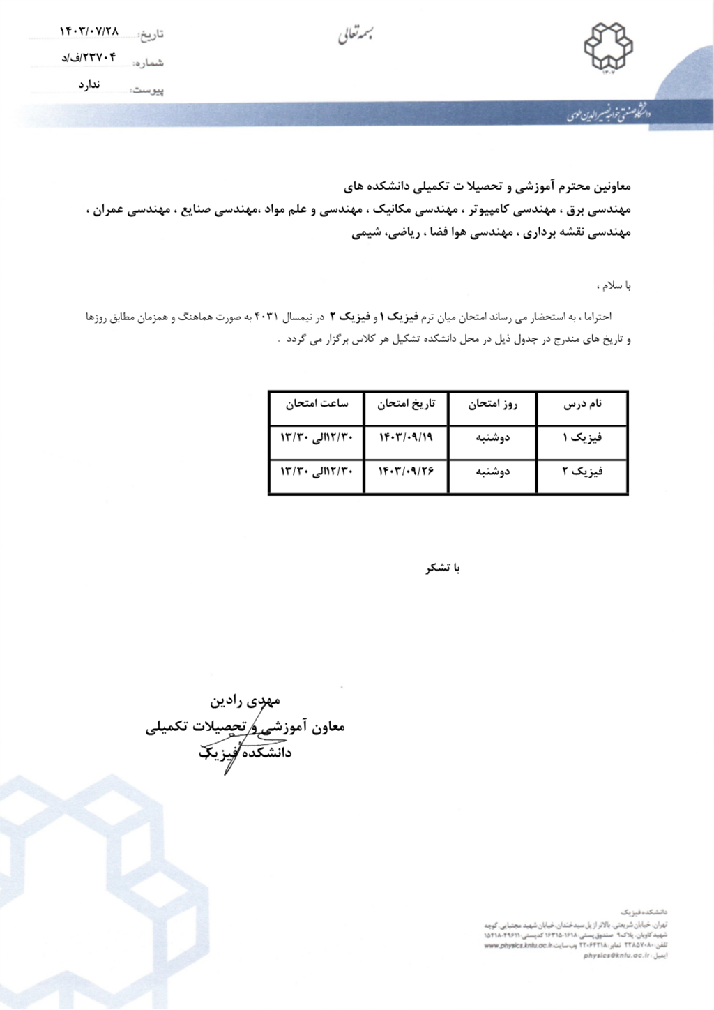 اعلام تاریخ امتحان میان ترم فیزیک 1 و فیزیک 2 نیمسال اول1404-1403