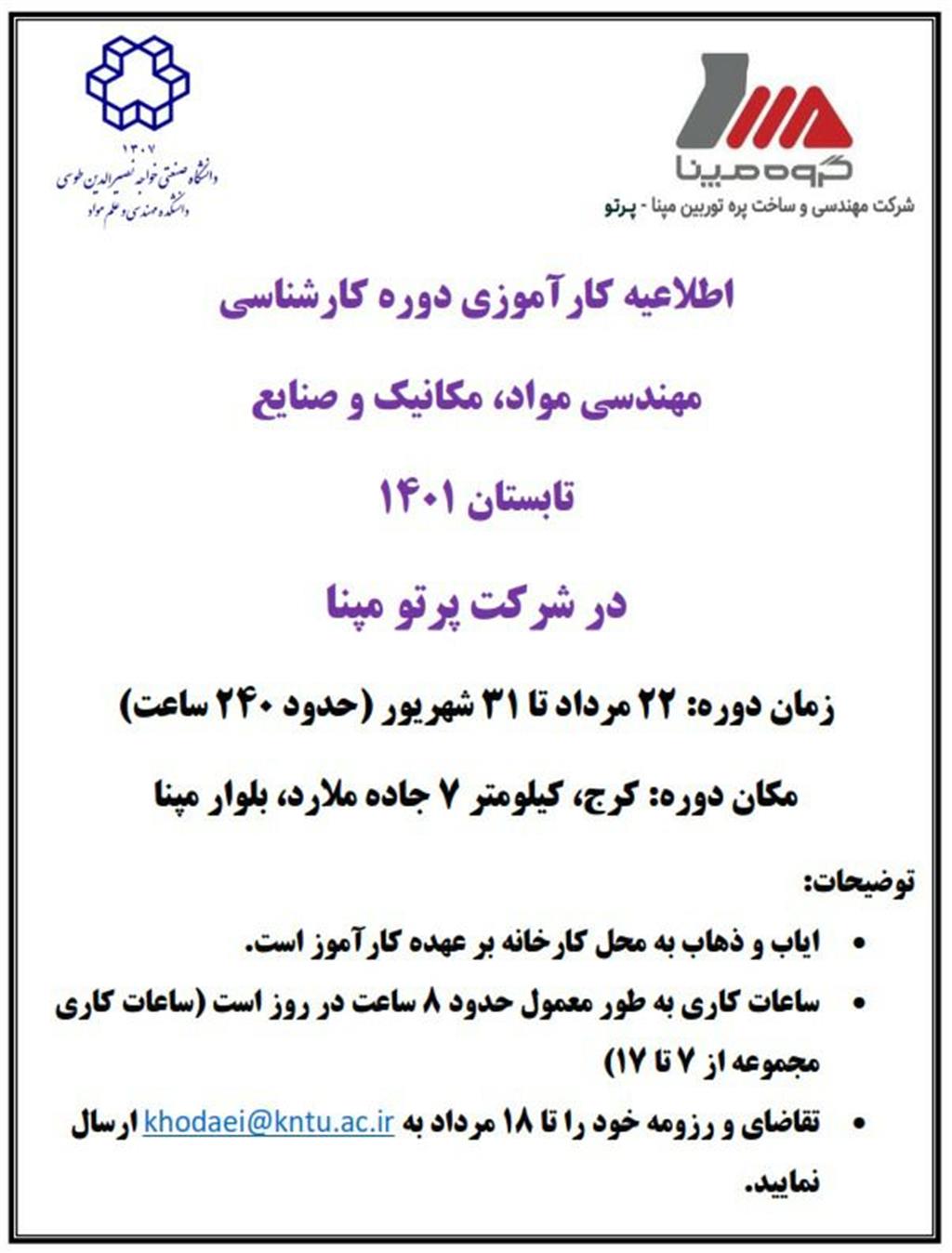 فراخوان کارآموزی در شرکت مپنا-پرتو (ویژه دانشجویان مقطع کارشناسی) - دانشكده مهندسی مواد