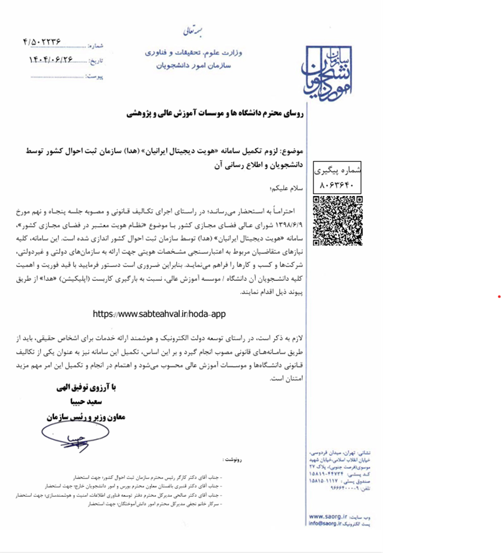 اطلاع رسانی لزوم تکمیل سامانه «هویت دیجیتال ایرانیان» (هدا) سازمان ثبت احوال کشور توسط دانشجویان