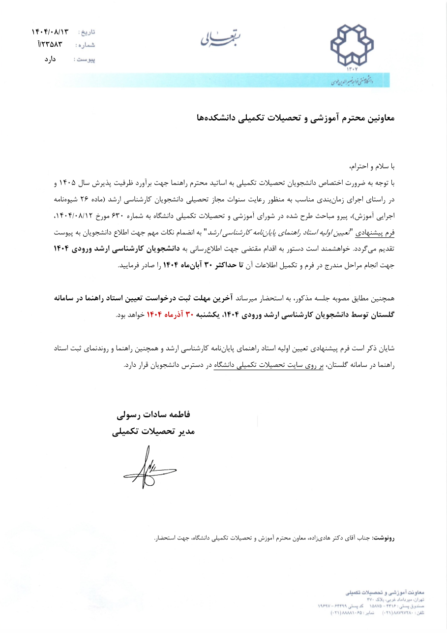 ارسال فرم پیشنهادی تعیین اولیه استاد راهنما و اعلام آخرین مهلت ثبت درخواست استاد راهنما در سامانه گلستان (دانشجویان کارشناسی ارشد ورودی 1404)