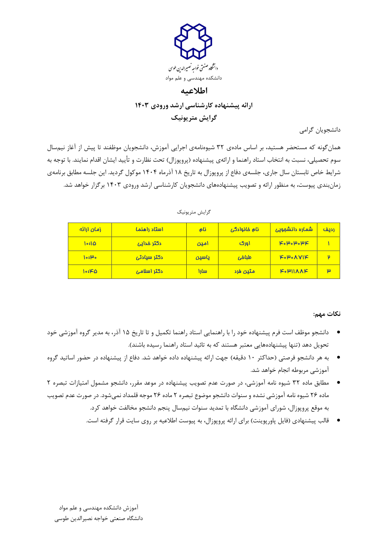 اطلاعیه زمان بندی دفاع از پروپوزال مقطع کارشناسی ارشد ورودی ۱۴۰۳ گرایش مهندسی متریونیک