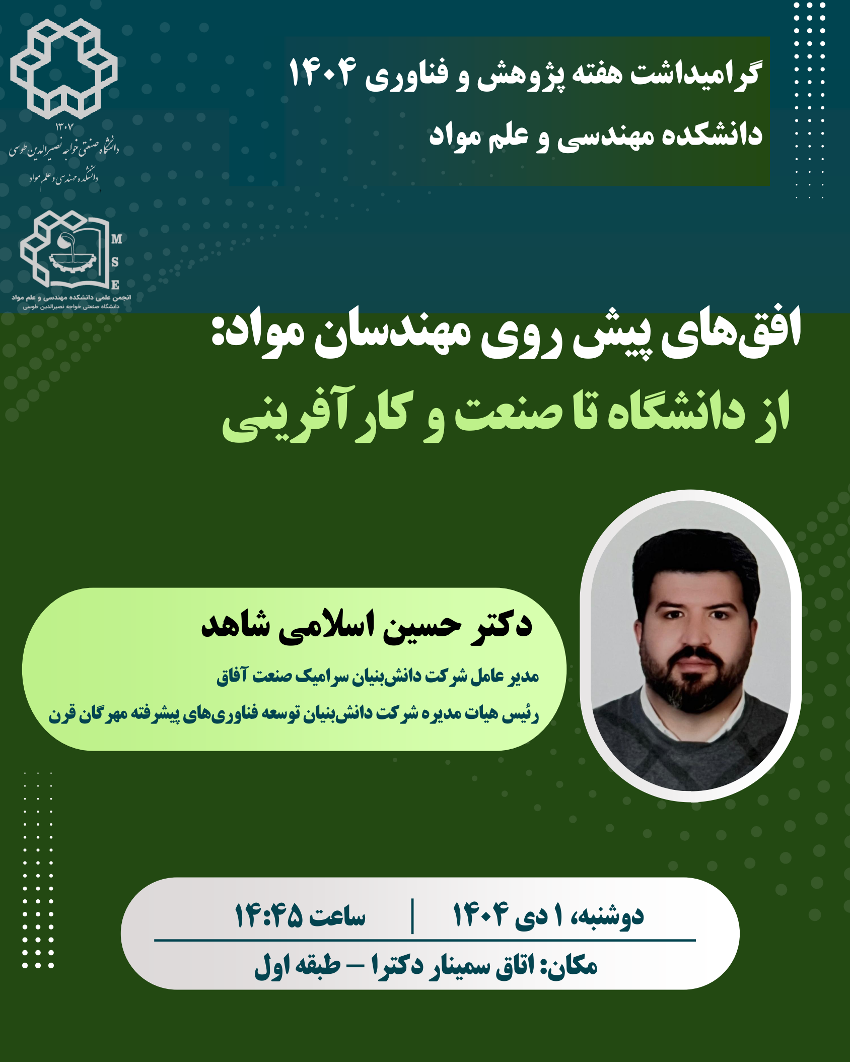 اطلاعرسانی سخنرانی با موضوع افق های پیش روی مهندسان مواد: از دانشگاه تا صنعت و کارآفرینی
