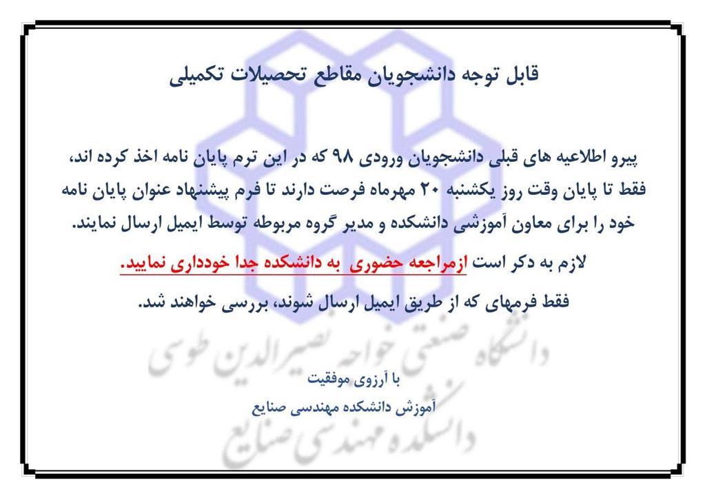 آخرین مهلت برای فرم پیشنهاد پایان نامه - آموزش صنایع