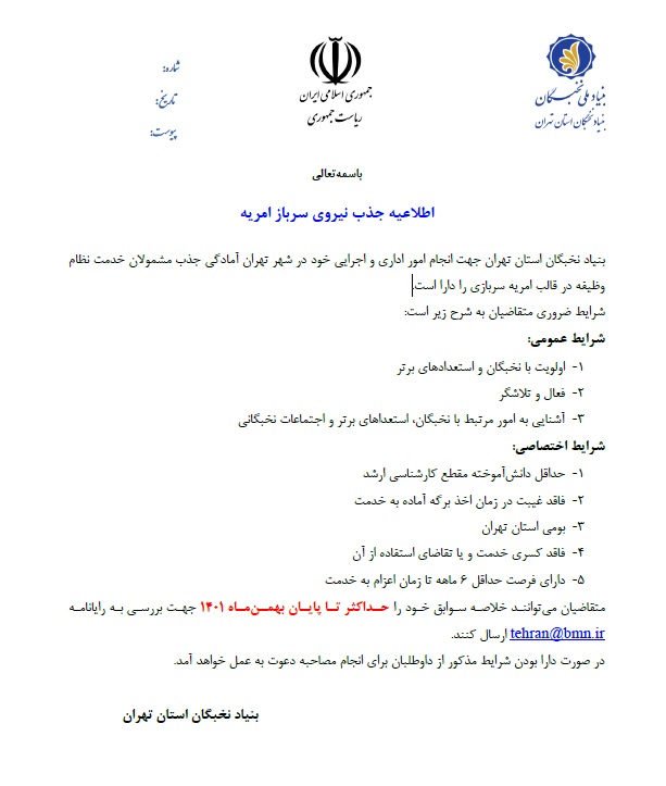 بنیاد نخبگان استان تهران جهت انجام امور اداری و اجرایی خود در شهر تهران آمادگی جذب مشمولان خدمت نظام