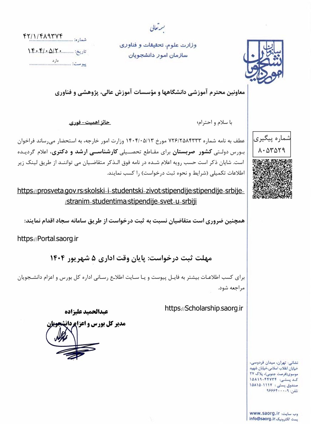 فراخوان بورس دولتی کشور صربستان در مقطع ارشد و دکتری
