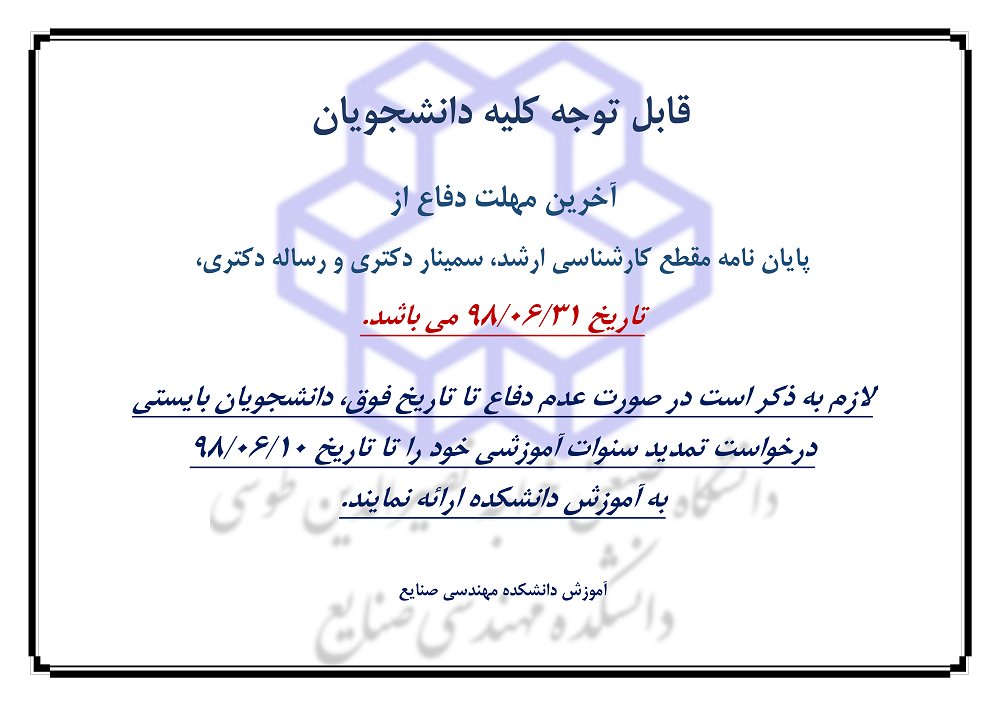 آخرين مهلت دفاع از پايان نامه، سمينار و رساله براي دانشجويان مقطع تحصيلات تكميلي - آموزش صنایع
