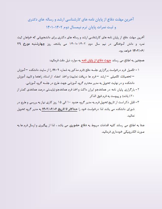 آخرین مهلت دفاع از پایان نامه کارشناسی ارشد و رساله دکتری در نیمسال دوم سال 1402-1401 روز چهارشنبه مورخ 1402/06/29