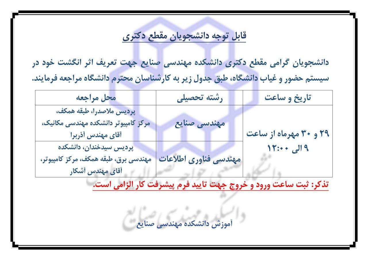 اطلاعيه ثبت ساعت ورود و خروج دانشجويان مقطع دكتري - آموزش صنایع