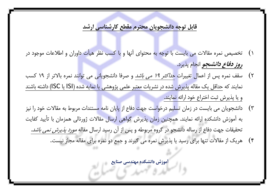 اطلاعيه مهم آموزشي در خصوص تاثير مقالات علمي بر نمره پايان نامه دانشجويان مقطع كارشناسي ارشد - آموزش صنایع