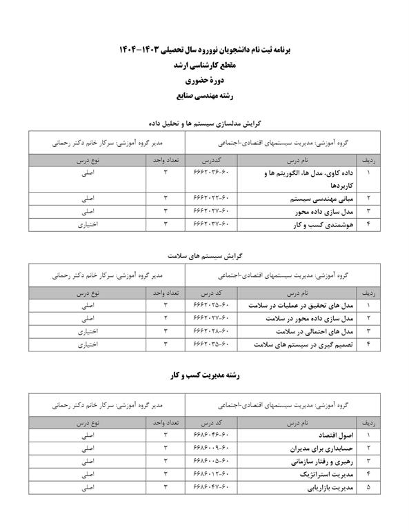 برنامه ثبت نام دانشجویان جدیدالورود دانشکده صنایع سال تحصیلی 1403-1404 (دوره حضوری) - آموزش صنایع