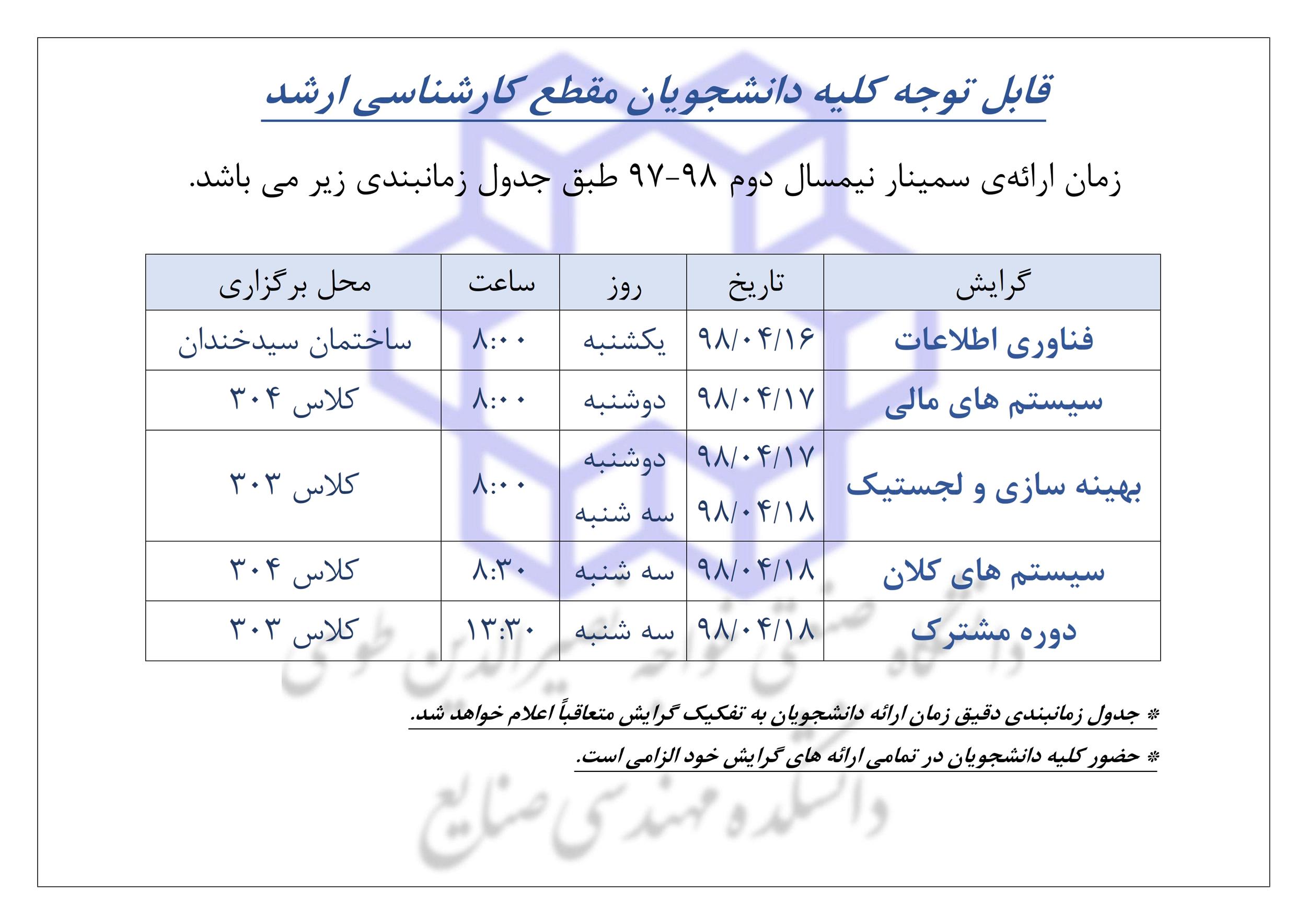 جدول زمانبندي ارائه سمينار هاي مقطع كارشناسي ارشد نيمسال دوم