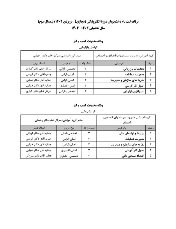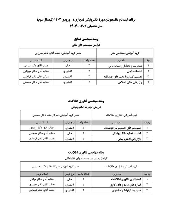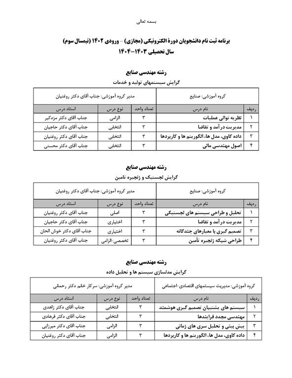 قابل توجه دانشجویان کارشناسی ارشد دانشکده مهندسی صنایع ورودی 1402 و ماقبل آن (نیم سال سوم)دوره الکترونیکی