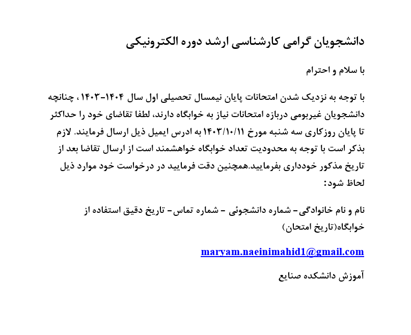 ارائه درخواست خوابگاه برای بازۀ امتحانات نیم سال اول ۱۴۰۴-۱۴۰۳ (داشجویان دوره الکترونیکی) - آموزش صنایع