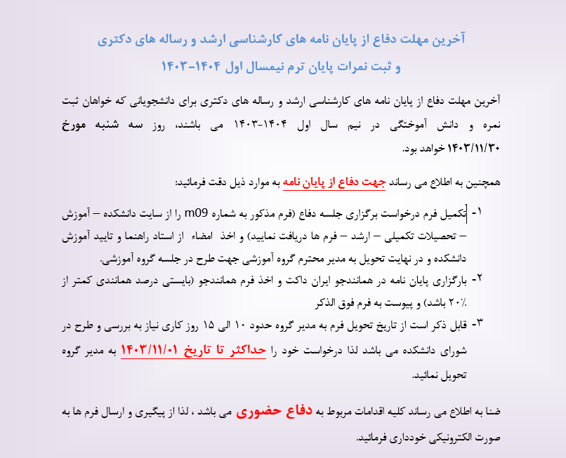 آخرین مهلت دفاع از پایان نامه های کارشناسی ارشد و رساله های دکتری و ثبت نمرات پایان ترم نیمسال اول ۱۴۰۴_۱۴۰۳