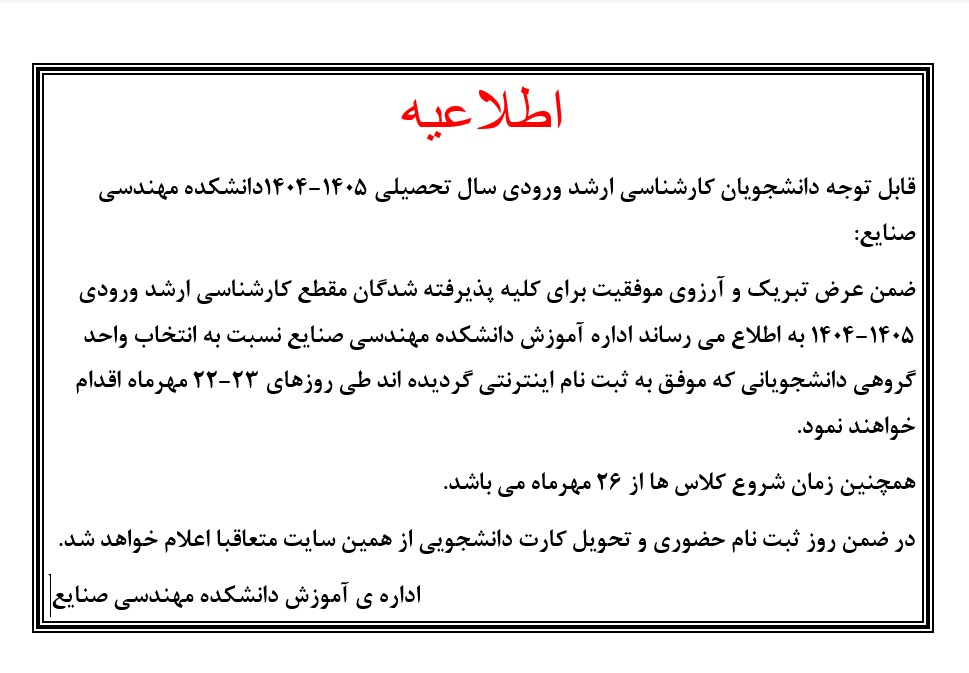 قابل توجه دانشجویان کارشناسی ارشد ورودی ۱۴۰۵-۱۴۰۵ دانشکده مهندسی صنایع - آموزش صنایع
