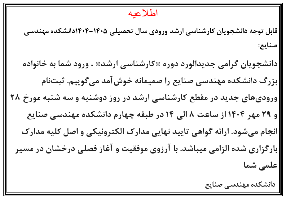 اطلاعیه ثبت نام حضوری دانشجویان ارشد ورودی 1405-1404-2 - دانشکده مهندسی صنایع