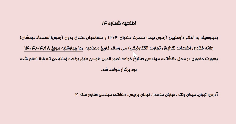 اطلاعیه شماره ۴ :تغییر تاریخ مصاحبه ی دکترا سال ۱۴۰۴ گرایش فناوری اطلاعات (با آزمون - استعداد درخشان)