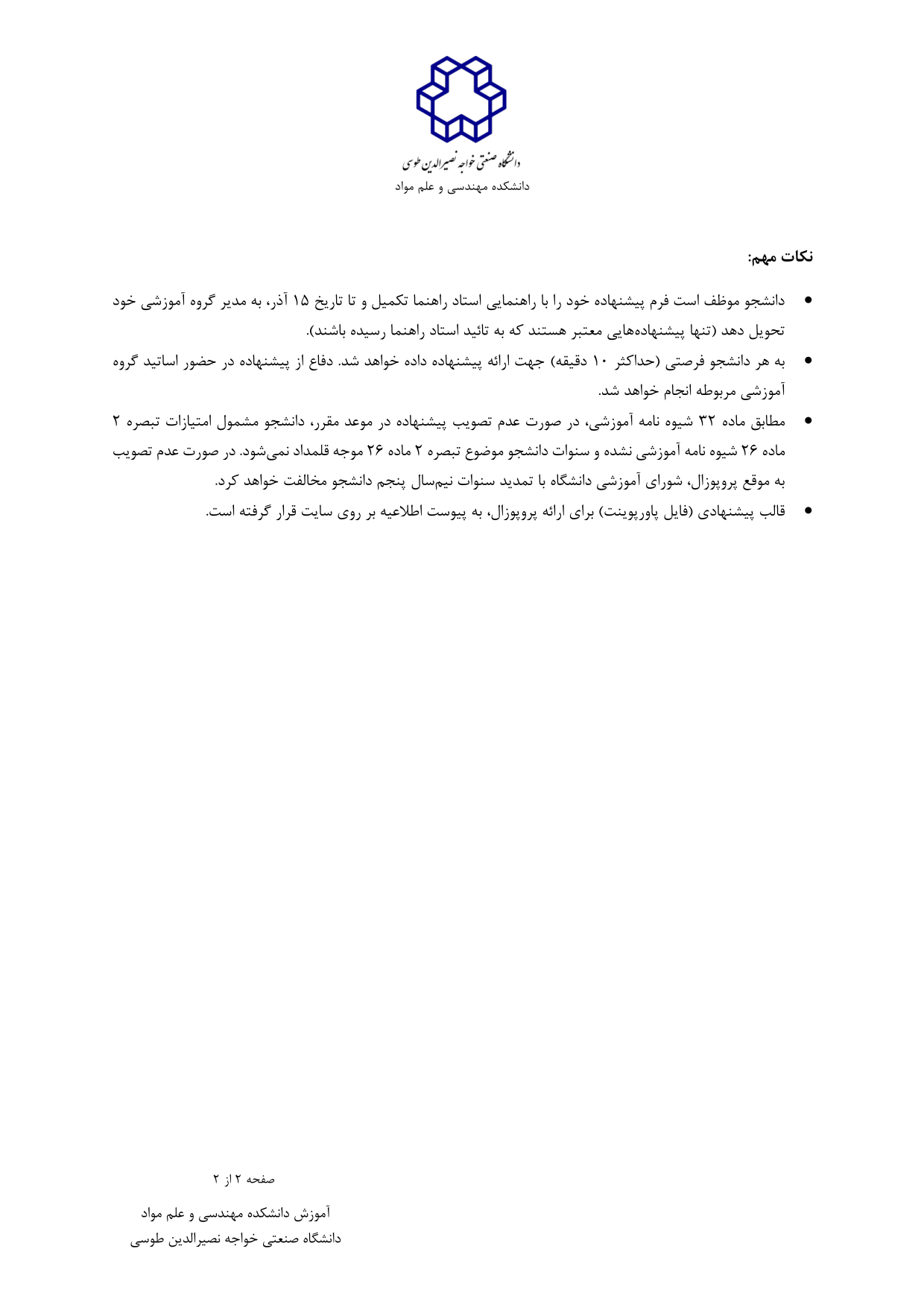 اطلاعیه زمان بندی دفاع از پروپوزال مقطع کارشناسی ارشد ورودی ۱۴۰۳ گرایش شناسایی و انتخاب مواد مهندسی