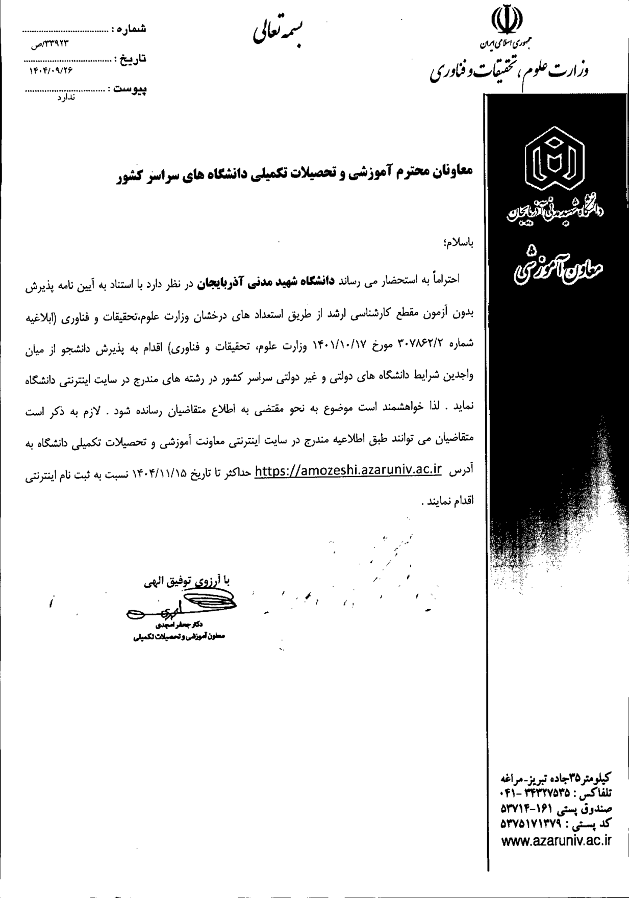 فراخوان پذیرش دانشجو بدون آزمون در مقطع کارشناسی ارشد از طریق استعداد های درخشان- دانشگاه شهید مدنی
