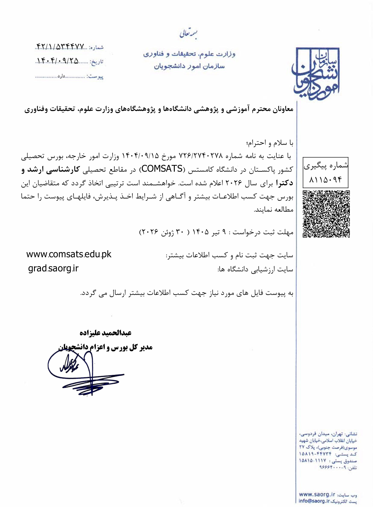 فراخوان بورس دانشگاه کامستس در مقاطع ارشد و دکتری در سال 2026