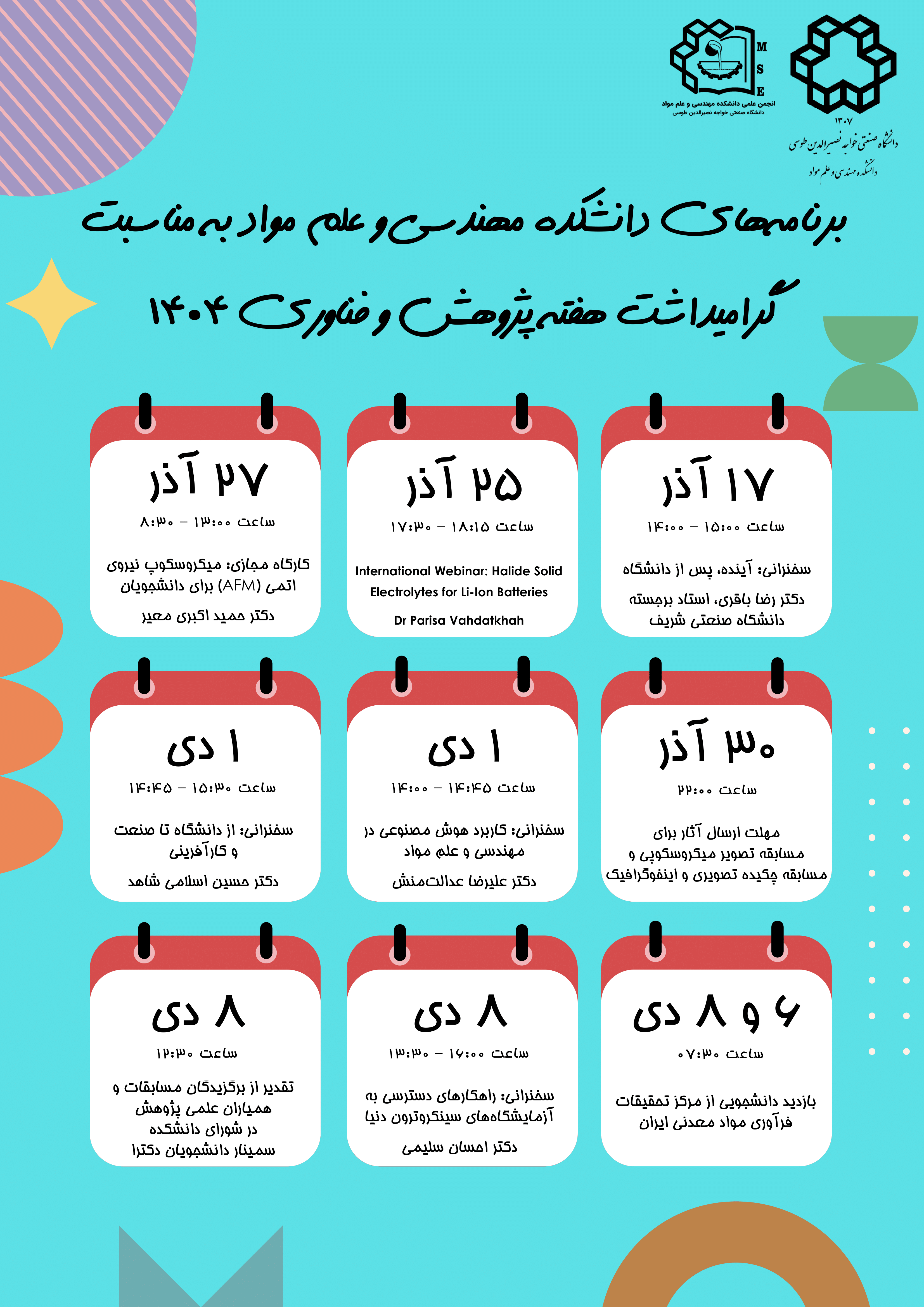 برنامه های دانشکده مهندسی و علم مواد به مناسبت گرامیداشت هفته پژوهش سال 1404